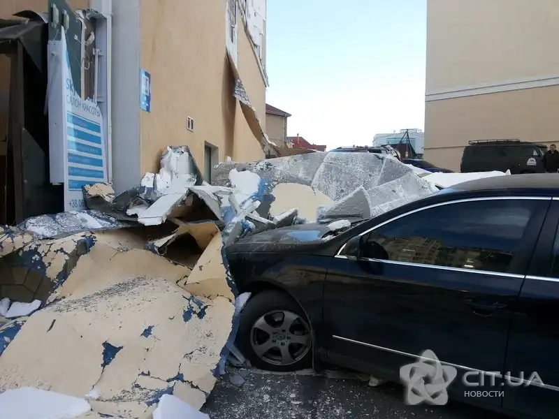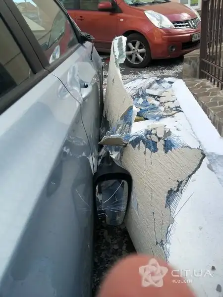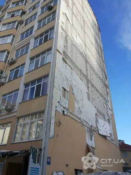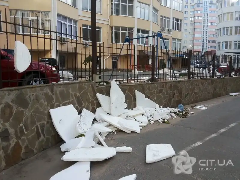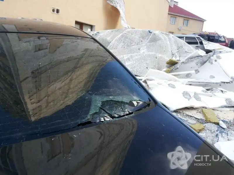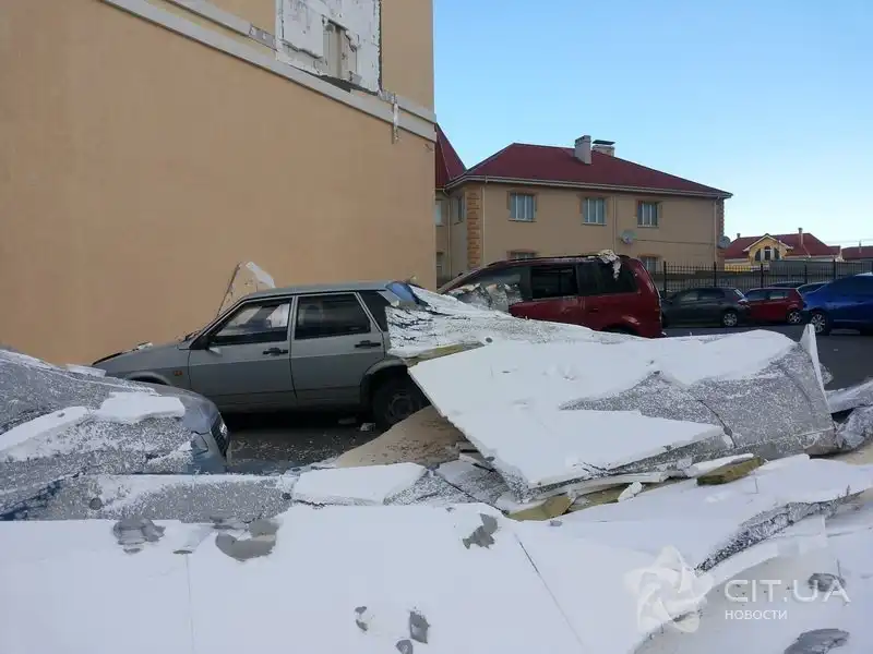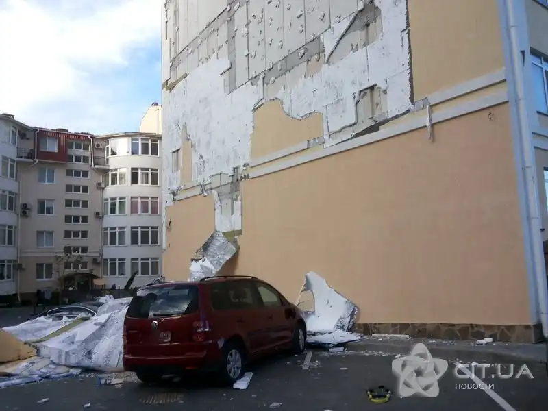 Сильными порывами ветра в ночь на 26 октября было полностью сорвано утепление на одном из многоэтажных домов. «Жертвами» непогоды стали автомобили на стоянке