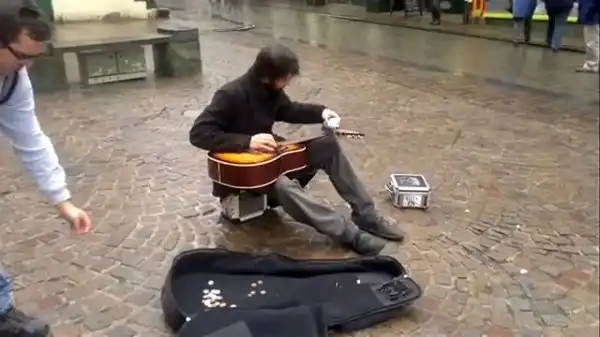 Уличный музыкант Jack Broadbent использует флягу для крепких напитков в качестве боттлнека