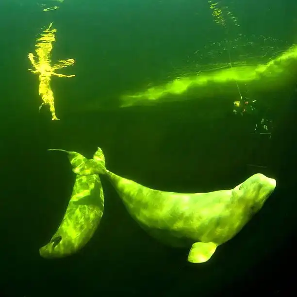 Голая девушка, спускающая под лед и в ледяную воду к двум ждущим её гигантским белухам…
