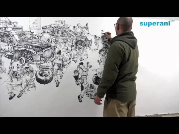 Это корейский художник, Kim Jung-Gi. Ему не нужны наброски, чтобы с невероятной скоростью создавать огромные детализированные рисунки.