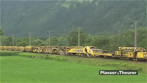 RU-800 S одновременно снимает старые и укладывет новые рельсы. За сутки машина меняет примерно 2 километра путей.