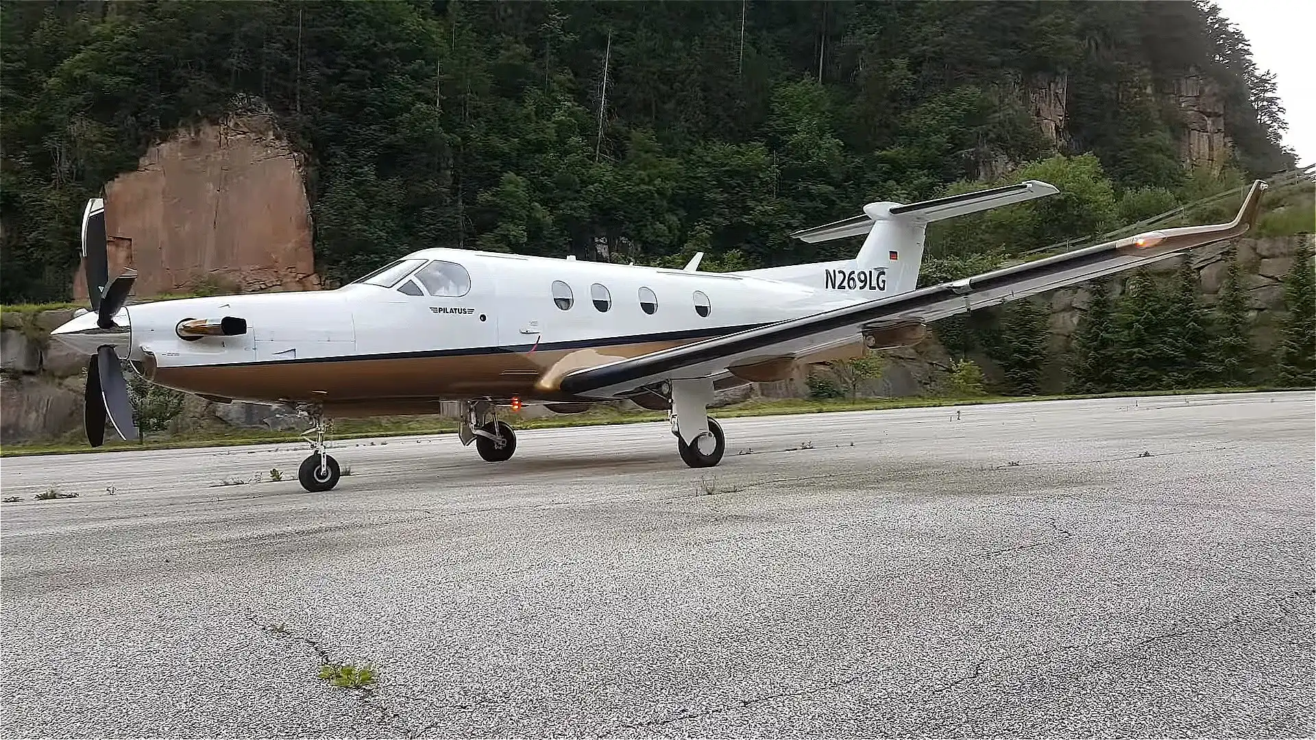 Небольшой частный самолёт Швейцарской компании Pilatus Pc12 взлетает и садится на небольшую