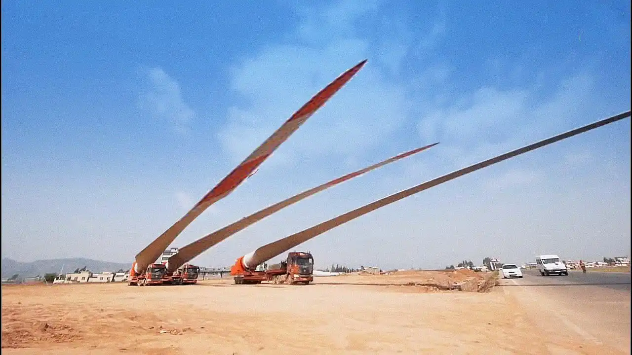 Транспортировка и монтаж самых крупных лопастей для ветровых турбин. Огромные грузовики перевозят длинные и громоздкие детали от огромных ветровых электростанций. Затем происходит их зрелищная установка на ветровую турбину.