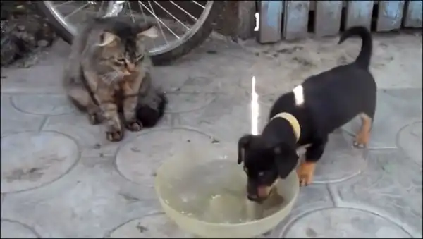 Щенок пытался вытащить рыбку из чаши с водой, и не видел, что за ним внимательно наблюдают...
