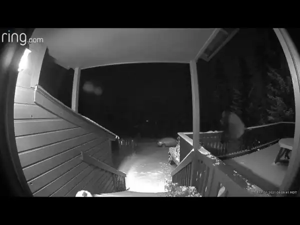 "Этот медведь - постоянный гость в моем доме. Около дома на заднем дворе с вечера стоял один из грузовиков компании по вывозу мусора для генеральной уборки с утра. Медведь залез на веранду и собирался прыгнуть в мусоровоз, но мы его спугнули".