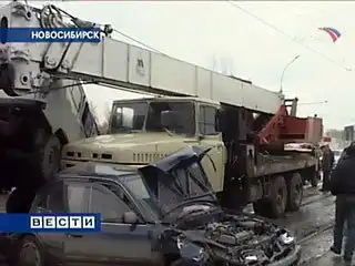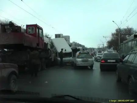 Многотонная махина смяла 17 автомобилей. От сильного удара один из них попал под трамвай. Никто серьезно не пострадал лишь по счастливой случайности.