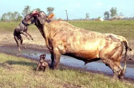 Эти Питбули напали на быка, потому что им нечего было есть, произошло это в Америке, после урагана (название не помню), но тогда эвакуировали всех жителей, а жывотных оставили. Полицейские отсняли эти кадры, а потом застрелили Буль. Уверяю, два Питбуля, быка бы завалили, потому что валят даже медведя.