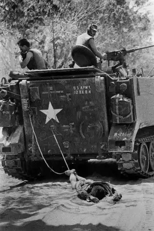 24 февраля 1966 года.Тан Бин в южном Вьетнаме. Американские военные волокут на верёвке тело вьетконговского повстанца... Автор - Киоичи Савада ("Юнайтед Пресс Интернешнл").