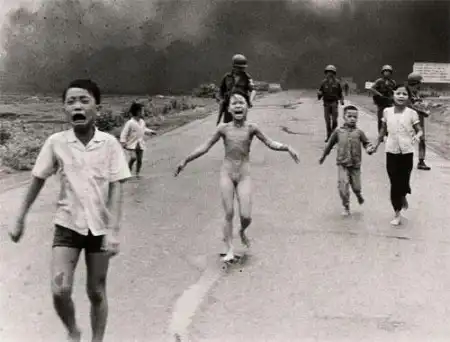 Одна из самых известных фотографий вьетнамской войны.8 июня 1972 года, Трангбанг в Южном Вьетнаме.Пан Ти Ким Пук спасается бегством от напалма, по ошибке сброшенного южновьетнамскими войсками..