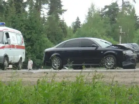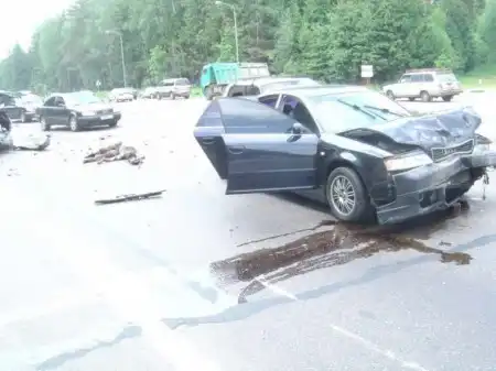 Владелец Ауди: Тойота вышла на встречу в метрах 30 от меня. Ехал с дачи, плотный поток. Ну и началось - Тойота зацепила Митцубиси. Митцу через крышу ушла на обочину встречки. Потом Тойота в лоб встретилась с Хаммером. Хаммер упал на крышу красной машины. Потом в эту кашу въехал Форд голубой, в него уже я. Подушки сработали, был пристегнут. Ни одной царапины.