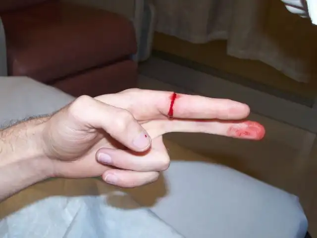 Когда мне лет 10 было, я значит взял банан, почистал его, и решил порезать, взял нож, самый большой, и как шеф повар решил его порубить, на -3-4 удал попал по левому указательному пальцу, на 1,5 см ниже ногтя почти в сустав, прорубил палец ровно на половину - прорубил пол кости, хорошо силенок не много было, а то так бы отрубил нах, просто замотал бинтом на пару недель, и все срослось щас только шрам остался.