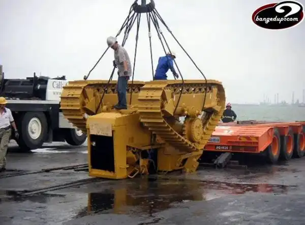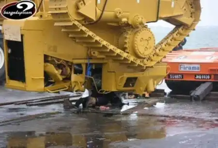 наверное пытался съехать с оранжевой платформы, той, что рядом стоит и трактор сильно наклонило и перевернуло