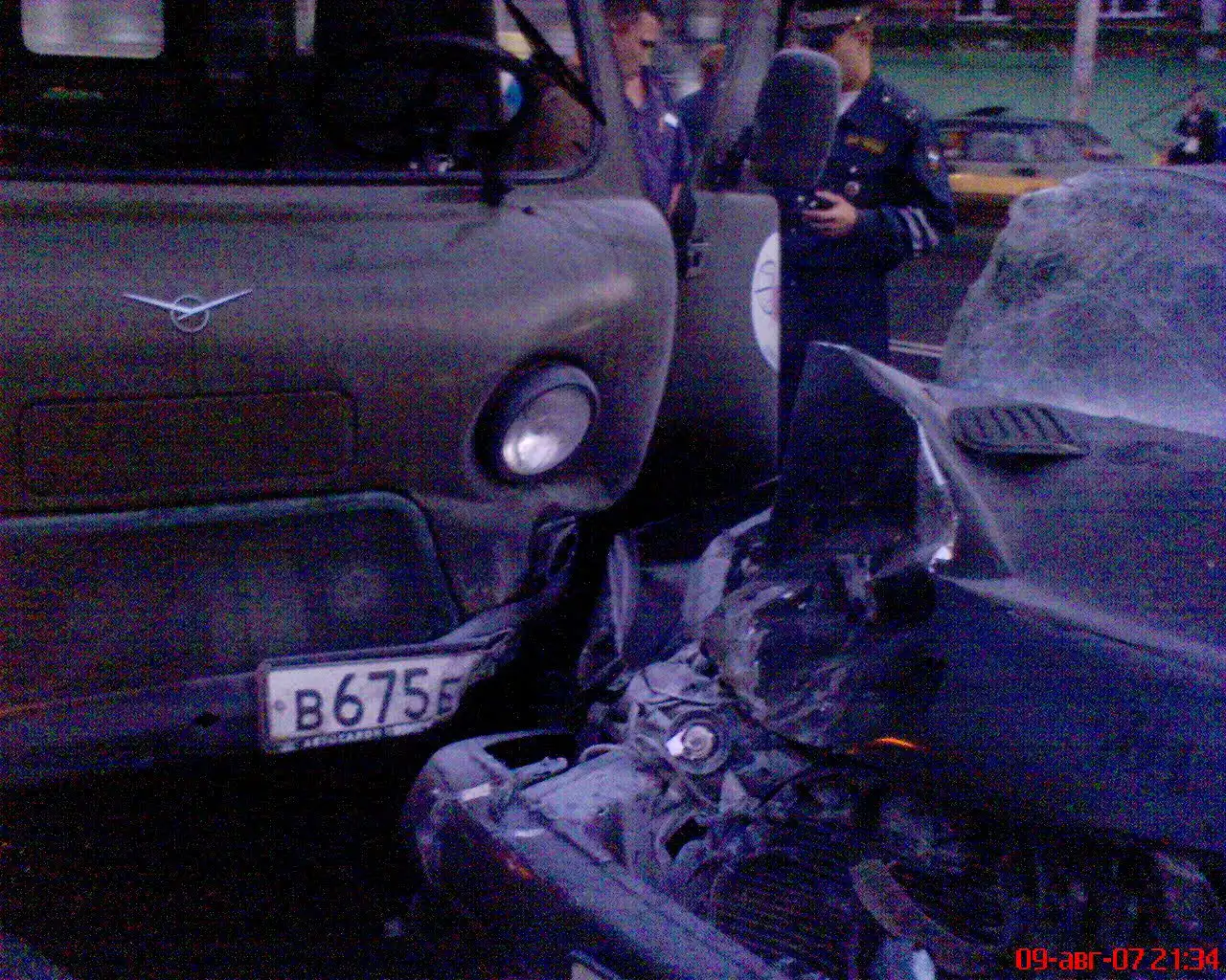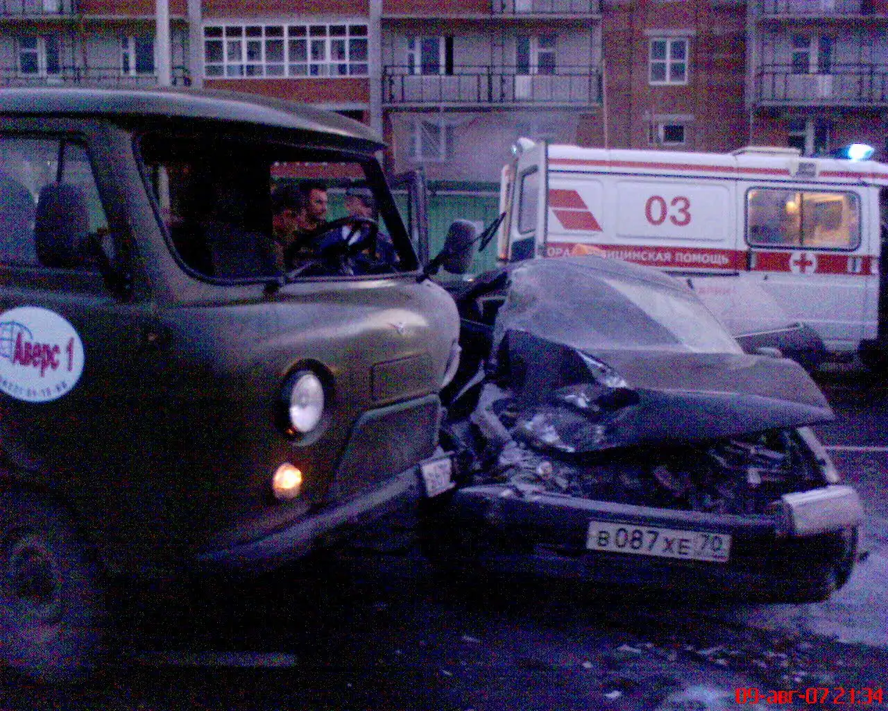 Мой уазик ехал по средней полосе от лебедева к сибирской по комсомольскому проспекту, слева паралельно нам ехал Vitz. Мы остановились под красный свет на пересечении Сибирской и Комсомольского, вдруг я замечаю как на нас летит со встречной полосы черная машина, под углом где-то 45 градусов относительно нас. Успел только выставить вперед руки и выбил ими лобовое. Мне повезло, я отделался легким испугом. Но наш водитель получил сотрясение, а наш пасажир рассек голову.