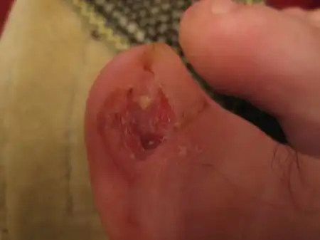 Просто когда ногти врастали он их бокорезом типа выковыривал из кожи..и в один прекрасный день занёс туда инфекцию...по началу вроде просто поболело как обычно бывает после того как вырезаешь..а потом распухать начало..ну сначала сам как то личился, водочкой так компрессы делал, потом понял что ещё чуть чуть и хана..пошёл в больницу.