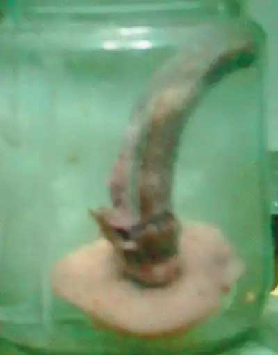 Этот удивительный экспонат - рог, выросший на черепе человека…Это последствия воровства… Судя по истории болезни, 45-летний мужчина залез ночью в чужой дом, где и был обнаружен возвратившимся хозяином. Хозяин как следует шарахнул вора палкой по затылку. Жулику удалось убежать, но через некоторое время он вынужден был обратиться в больницу, потому что на затылке у него вырос рог, очень плотный, из соединительной ткани, пропитанной кератином. Длина отростка 7 сантиметров, диаметр - 1,5. Рог вырос как раз на месте травмы, полученной при попытке кражи…