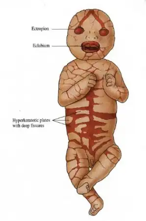 У плода наблюдаются серьёзные отклонения в развитии глаз, рта, носа, ушей и конечностей. Наряду с этим наблюдается значительное по площади ороговение наружных покровов тела, что обуславливает наличие глубоких трещин на коже.