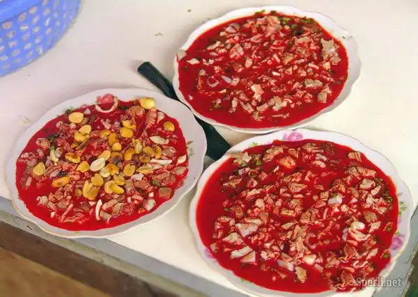 Правильно. Это суп из крови утки. Ингридиенты: кровь соответственно фрэш, репчатый лук, сухарики и жареный арахис.