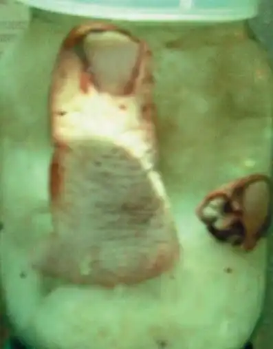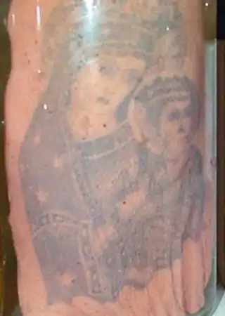 фрагмент кожи с татуировкой размером 20 на 16 сантиметров в банке с формалином.. Следуя моде, 20-летний молодой человек наколол себе Богородицу с младенцем. Татуировку из глупого озорства попросил сделать на внутренней стороне бедра, почти в паху – якобы, «для привлечения женского внимания». В больницу он попал спустя несколько месяцев после того, как наколол рисунок. Говорил, что сначала все было хорошо, ничего не беспокоило. А потом вдруг нога неожиданно воспалилась - сначала палец, потом выше. Началась гангрена, и конечность пришлось ампутировать…