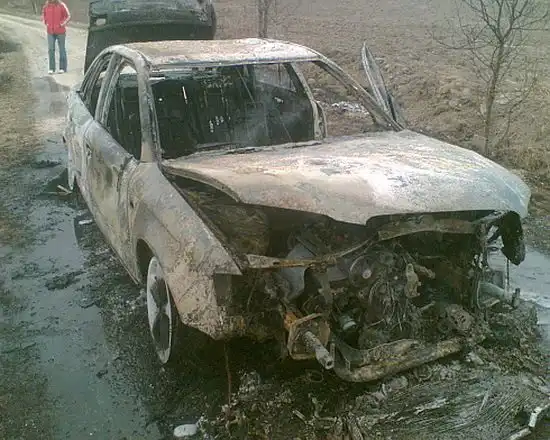 Огонь на участке мы утихомирили. Ветер приутих. Машина сгорела до тла за 5 мин. Бак , слава богу, хоть и целый, но не взорвался. (говорят, что взрывается в 7% случаев). Дом кирпичный, не загорелся поэтому, а так еще и дом могли спалить. От машины остался лишь маталлический корпус. Колесные диски расплавились, двигатель, подвеска, все отвалилось, в салоне не осталось ничего, лишь каркасы кресел.