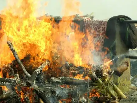Обряд похорон в Индии тоже отличается особенностями. В Индии нет кладбищ — только священные места, на которых сжигают умерших. К такому месту выносят обернутого в полотно покойника, его старший родственник разжигает костер. Когда огонь гаснет, обгорелые останки помещают топят в реке. После этого семья умершего десять дней или больше носит траур — кусок белого полотна. Участь вдовы особенно жалка. Вторично замуж она выходит редко, а в прежние времена, особенно среди высших каст, считалось нормальным, когда жена, будь она даже девочкой 13—14 лет, только что выданной замуж, живьем сжигала себя на костре рядом с трупом мужа. Естественно сейчас это не практикуется... Зато страшна другая особенность , обычно труп не успевает утонуть , если останки прибило к берегу или они рядом с ним , собаки вплавь пускаются за мясом и моментально уничтожают недогоревший прах ...