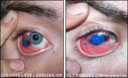 Нда, впервые увидел пигментацию глаз. Хотите расскажу как это делается? Закатывается на верх зрачок, а в белок глаза ставится укол, процедура конешно безболезненная но, оооооочень не приятная. Сам через такое прошел но мне глаз спасали, досих пор вспоминаю. А придурка который на это добровольно пошел ни когда не пойму!