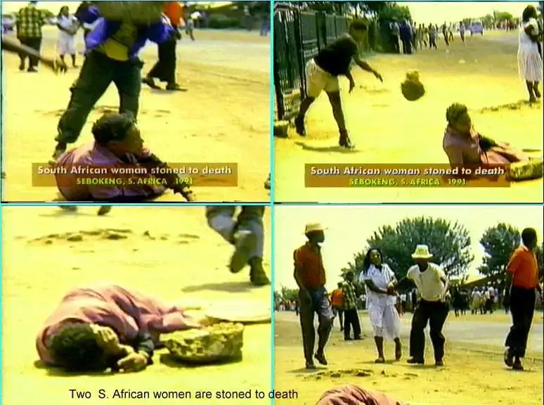 Также подлинные кадры, другое время 1991 год, другое место - Южная Африка. Сюжет тот же - толпа забивает женщину насмерть камнями. Похоже последняя глыба проломила ей голову.