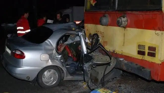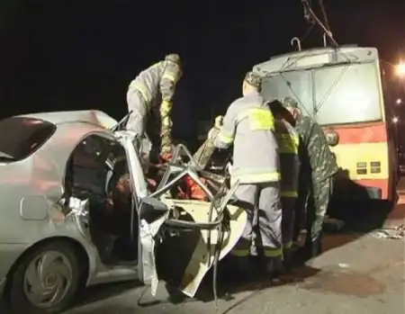 Такси Daewoo Lanos на огромной скорости влетел под стоявший троллейбус. Легковушку искорежило до неузнаваемости – ее передок изувечило вплоть до центральных стоек.