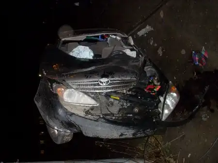 Камри занесло, она задним колесом врезалась в рельс её подкинуло, перевернуло, она врезалась в столб и упала