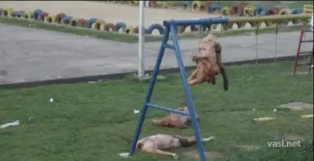 На детской плащадке!!! Не кма не фантазии, хотябы загородом! А вот парень весит у него крюк в жопе?