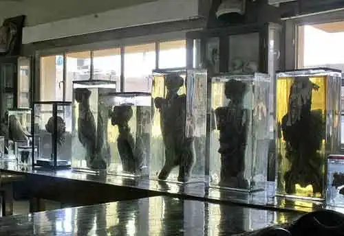 И последняя обязательная коллекция таких музеев - коллекция скелетов. Их только вываривают в специальном формалиновом расстворе несколько суток. А потом собирают и скрепляют тончайшими скобами каждую косточку... Так что можете считать, что эта двухголовая собака - настоящее произведение искусства...