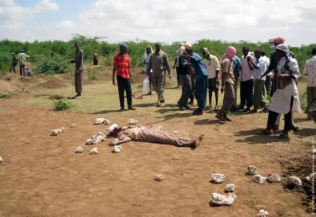 13.12.2009, Сомали | Шариатский суд в Афгойе приговорил 48-летнего Мохамеда Ибрагима к смертной казни через побивание камнями за внебрачную связь с женщиной. Приговор был приведен в исполнение бойцами отряда исламистов Хизбул Ислам: