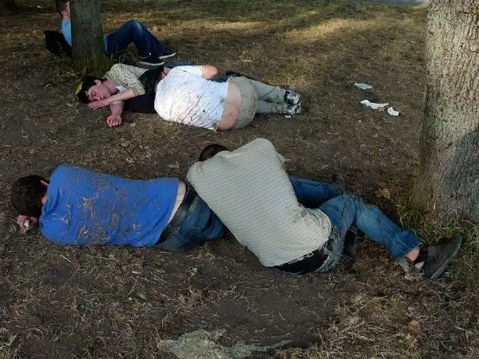 что касается спящих пьяных на поляне, то уж че че , а русский человек какой бы пьяный не был, большинство до дома прутся))