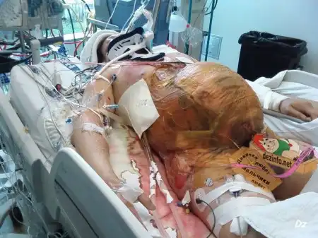 лет 18 назад я лежал в больнице с девочкой, которую переехал автобус, она ходила как бочка в перевязках... часть кишков порвано, иногда швы расходились и дерьмо подтекало через перевязки... но при мне она уже заново училась ходить, так что как выглядит первая стадия лечения - не знаю