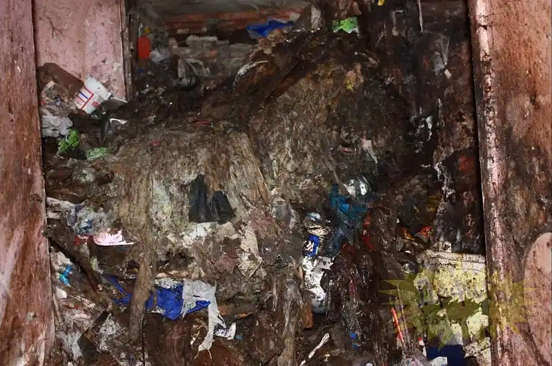 В этом доме жили муж и жена , 8 лет ... В туалет они ходили прямо на пол или на стены , или на мебель , в общем куда придётся . В собственных экскрементах они и спали. В общей сложности , на каждого человека , за эти годы пришлось более 9 тонн мусора .