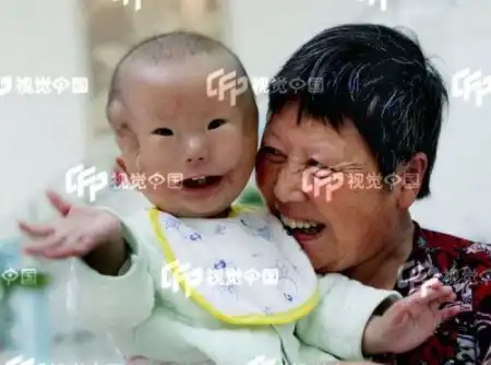 У мальчика как будто маска на лицо одета. Этот мальчик родился год назад в Шанхае с редким случаем отсутствия полоски черепа. Хирургическому вмешательству он не подлежит, так как в его случае это крайне опасно.