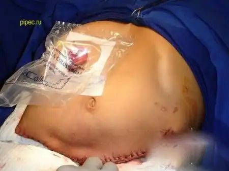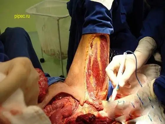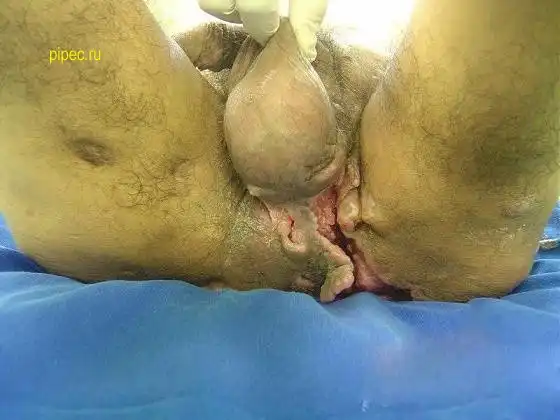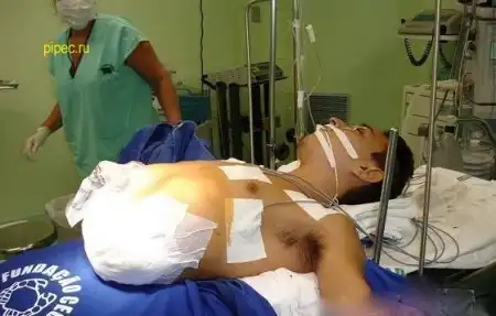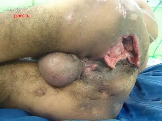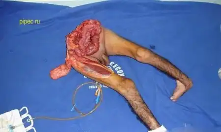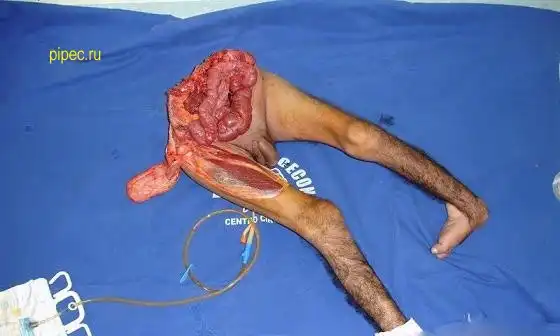 Я где то видел описание, в общем: парень не мог ходить после аварии, родственники плохо за ним следили, образовались пролежни и результат у вас перед глазами. Через некоторое время после операции он скончался от почесной недостаточности.