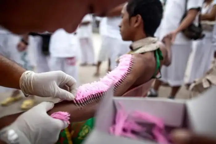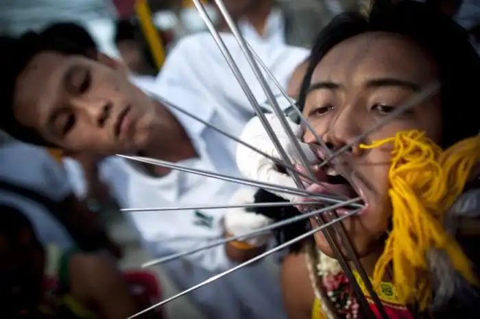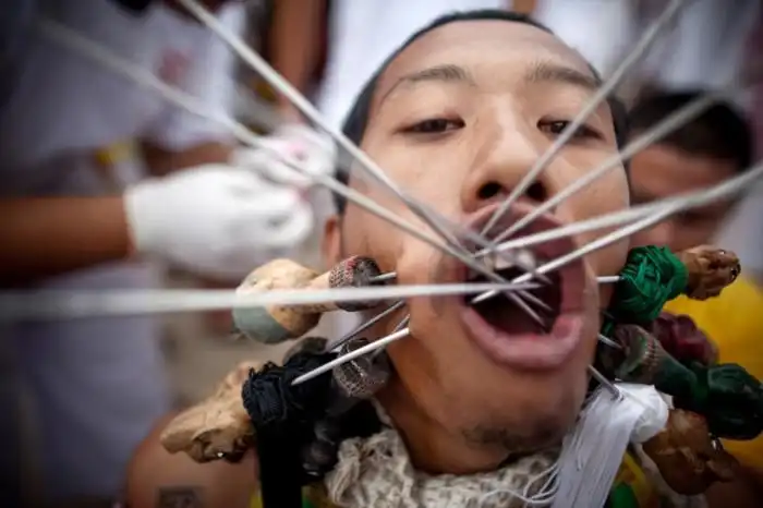 это такая религия, точных аспектов не помню, но это у них религиохный праздник, проходит он вот таким парадом, кстати что интересно у них не остаеться шрамов после этого, и шеки очень быстро зарастают, тут кстати где то была уже статья об этом