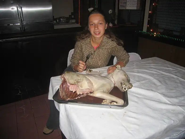 Ебать какое страшное блюдо в виде страшной телки подают в азии, а собака на закуску к телке )))