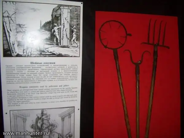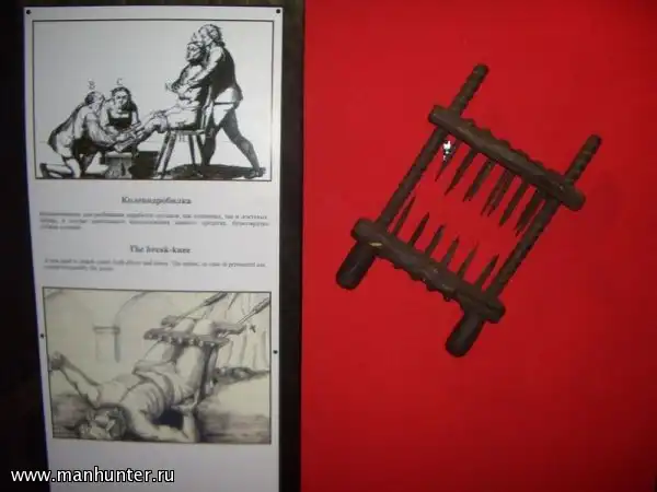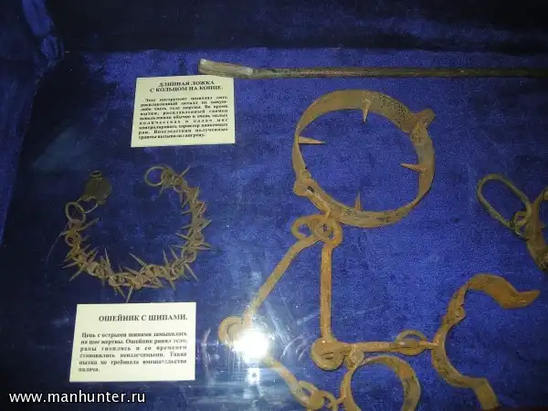 Ошейник с шипами. Цепь с острыми шипами замыкалась на шее жертвы. Ошейник ранил тело, раны гноились и со временем становились неизлечимыми. Такая пытка не требовала вмешательства палача.