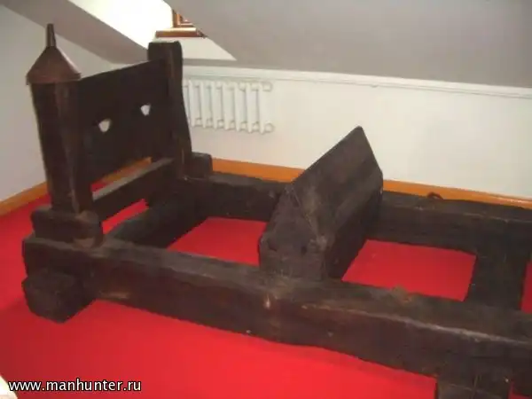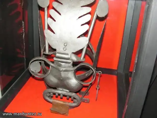 Тиски для больших пальцев ("Ручной зажим"). Дробление суставов подследственного - один из самых простых и действенных методов пытки, который использовался с древнейших времен. В России этот пыточный механизм более известен как "Винтовой ручной зажим", прозванный в народе "репкой" (в сжатом состоянии он отдаленно напоминает этот овощ). С "репкой" связана русская пословица: "Хоть ты матушку-репку мне пой!". Представленное здесь устройство - точная копия, сделанная по чертежам, приложенным к "Криминальному кодексу императрицы Марии-Терезии", изданному в Вене в 1769 году. Появление такого "труда" в эти годы было явным анахронизмом для Европы: к этому времени пытки уже были отменены в Англии, Пруссии, Тоскане и множестве мелких княжеств. Это руководство подробно описывает процедуру проведения пыток, а также дает судьям ряд практических рекомендаций. Спустя всего семь лет, "Кодекс" был отменен Иосифом II - сыном императрицы.