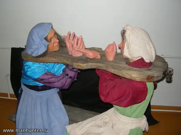 "Скрипка сплетниц" могла быть деревянной или железной, для одной или двух женщин и своей формой напоминала этот изысканный музыкальный инструмент. Это орудие мягкой пытки, игравшее скорее психологическую и символическую роль. Нет документальных свидетельств о том, что использование этого устройства приводило к физическим увечьям. Применялось оно, в основном, к виновным в клевете или оскорблении личностям. Руки и шея жертвы закреплялись в небольших отверстиях так, чтобы наказанная оставалась в молитвенной позе. Можно представить себе страдания жертвы от нарушения кровообращения и боли в локтях, когда устройство надевалось на долгий срок, иногда на несколько дней.