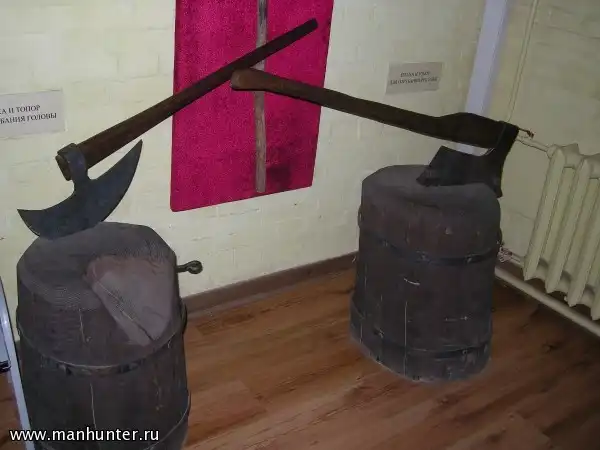 Слева на фотографии топор и плаха со специальной выемкой для отрубания головы, справа - топор и плаха для отрубания рук и ног.