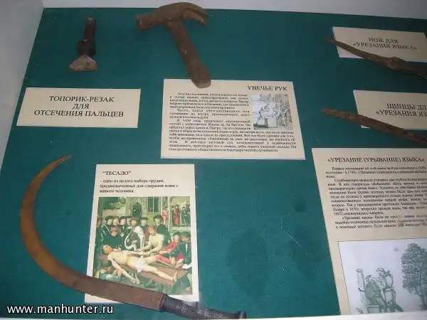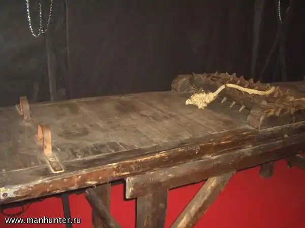 "Утробная кошка" предназначалась для введения в "утробу" (живот), наматывания и вытаскивания внутренностей. Это орудие одной из самых мучительных и страшных казней во времена Средневековья.