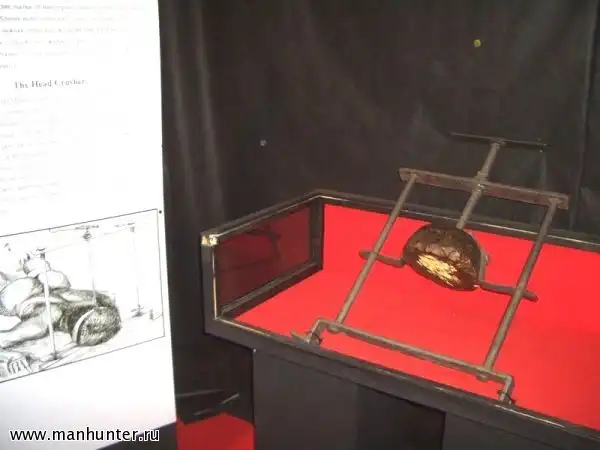 Обруч с винтами. Это орудие было снабжено острыми шипами, которые до кости прокалывали кожный покров головы, не ломая при этом череп. Система винтов позволяла регулировать проникновение шипов с точностью до миллиметра