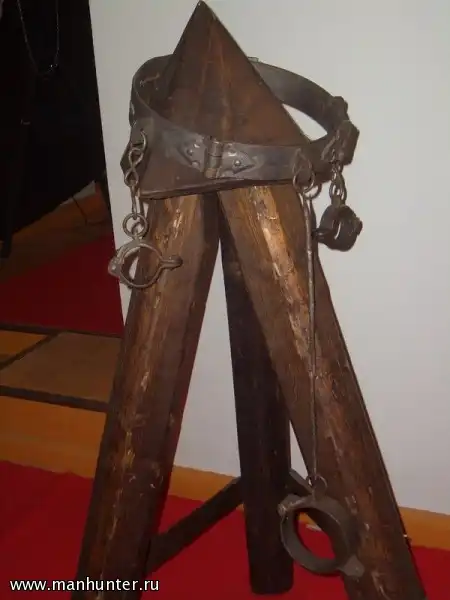 Жертву усаживали верхом на этот пыточный аппарат с привязанными к запястьям и лодыжкам гирями. Острое ребро перекладины впивалось в промежности, вызывая нестерпимую боль.