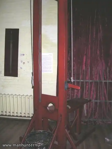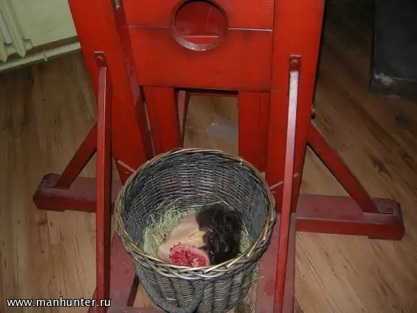 Гильотина - орудие для обезглавливания осужденных на казнь. Состояла из двух столбов, соединенных перекладиной, между которыми скользило по фальцам острое лезвие весом около 40 кг; в момент казни оно с силой падало на закрепленную под ним шею заключенного. Несмотря на одиозную репутацию, которую гильотина приобрела в эпоху Французской революции, она использовалась почти два столетия. В 1870-1872 она была даже усовершенствована помощником палача и плотником Леоном Берже. В 1939 году Франция отменила публичное гильотинирование; последняя публичная казнь состоялась 17 июня 1939 года на площади перед тюрьмой Сен-Пьер в Версале. С этого времени гильотинирование происходило внутри тюремных стен. Последний казненным таким способом стал убийца Хамида Джандуби, обезглавленный в Марселе 10 сентября 1977 года.