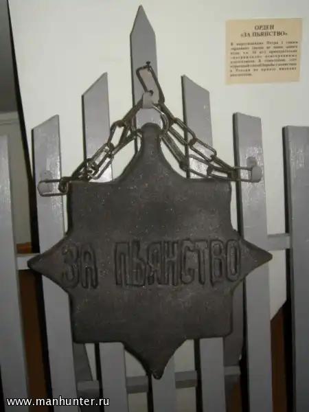 В царствование Петра I таким "орденом" (весом не менее одного пуда, то есть 16 кг) принудительно "награждали" неисправимых алкоголиков. К сожалению, этот курьезный способ борьбы с пьянством в России не принес никаких результатов.