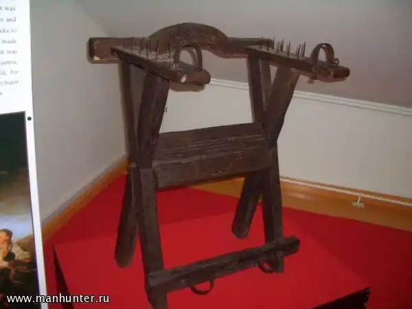 "Стул ведьмы" - оснащенный шипами и наручниками стул с блоками для фиксации положения жертвы и с железным сиденьем, который в ряде случаев раскалялся огнем. Этот распространенный инструмент особенно широко использовался австрийской инквизицией. В 1693 году в австрийском городе Гутенберг судья Вольф фон Лампертиш вел процесс по обвинению в колдовстве Марии Вукинец, 57 лет. Она была посажена на "Стул ведьмы" на 11 дней и ночей, одновременно палачи прижигали ей ноги раскаленным железом. Мария Вукинец умерла под пытками, сойдя с ума от боли, но так и не сознавшись в преступлении.