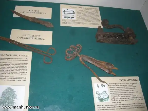Щипцы и клещи использовались при "пытке каленым железом". Такая пытка являлась либо заключительным испытанием, с помощью которого "затверждали" полученные ранее показания, либо, если нужные показания еще не были получены, становились самостоятельной, особо тяжелой мукой. В последнем случае "жечь огнем" могли многократно: раскаленными до красна клещами ломали ребра пытаемого. Тогда жизни жертвы угрожала смертельная опасность. Небезынтересно отметить, что на Руси раскаленные клещи не применялись для пыток женщин и детей.