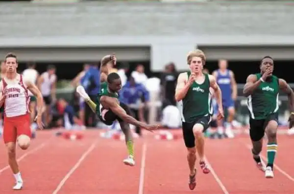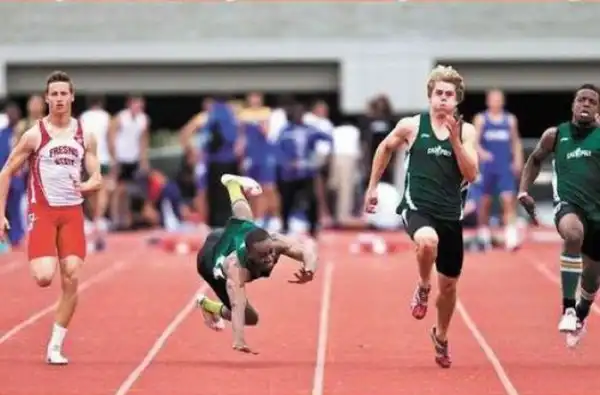 Этому спринтеру очень не повезло во время соревнования. Он споткнулся, и падение было довольно жестким. Множественные переломы ему точно обеспечены, и, боюсь, он больше никогда не сможет бегать.